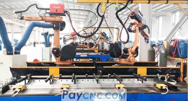 Due to the long workpieces, the project uses two robots to weld at the same time, with H-type two-station layout;