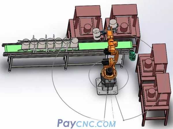 1 set of RMD20 palletizing robot, 1 set of customized flexible hand grips, 1 set of automatic oiling brush machine, 1 set of cutting conveyor line, supporting 1 hydraulic press, 1 laser cutting machine to complete the oiling and feeding of the decorative plate of the kettle Hydraulic forming, laser trimming, and off-line collection of finished products;