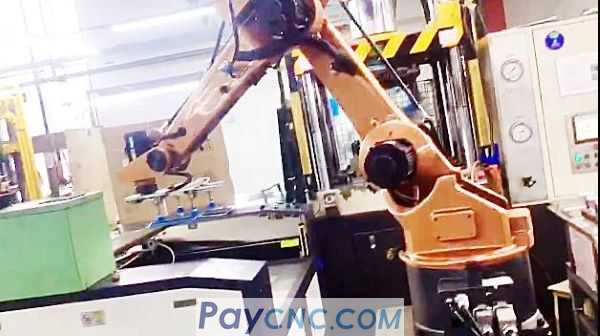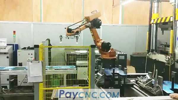 The robot replaces the manual, completes the production process of the workpiece brushing oil, the robot loading and unloading the hydraulic press, and then the laser cutting machine
