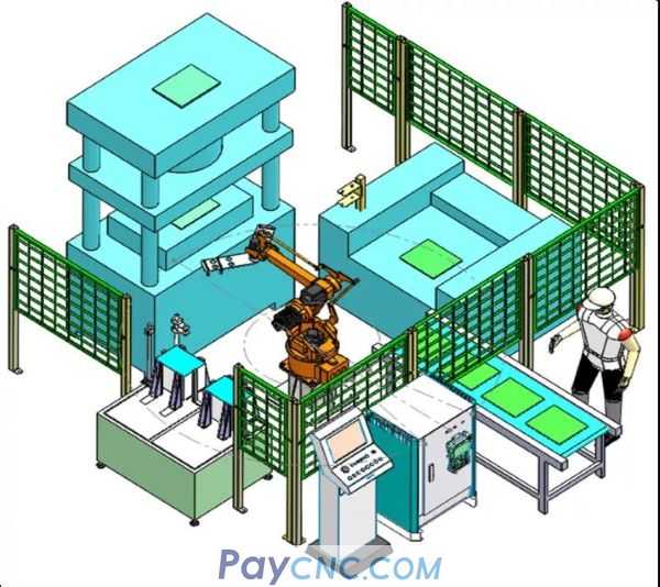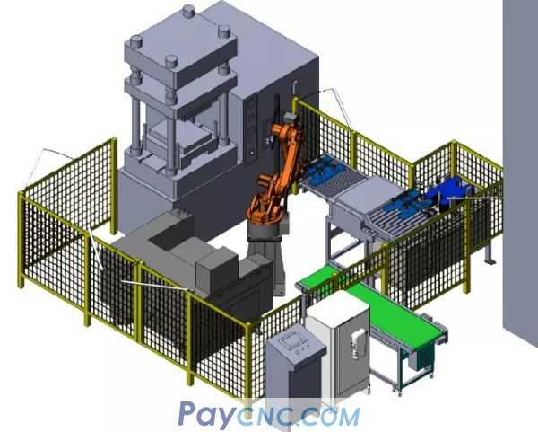The robot replaces the manual, and completes the production of the workpiece loading and unloading between a hydraulic press, a laser cutting machine, and a loading and unloading warehouse;The production time of the special machine is 25 seconds, and the production capacity of the production line: 120 pieces / hour;