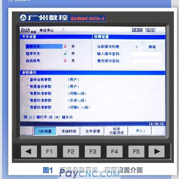01 Press the system "Settings" button and select "CNC Settings", as shown in Figure 1; press the [ON (L)] soft key below the screen to turn on the system parameter switch. Move the cursor to the "input operation password" line, enter the three-level authorization password: 12345, after the input is completed, the [input] key can enter the three-level operation authorization.