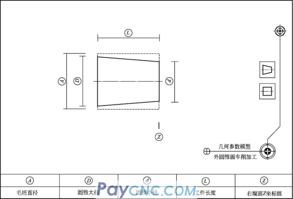 Establish the geometric parameter model of turning the outer cone as shown in Figure 2-2. The blank diameter A, length L, cone diameter D and cone diameter d