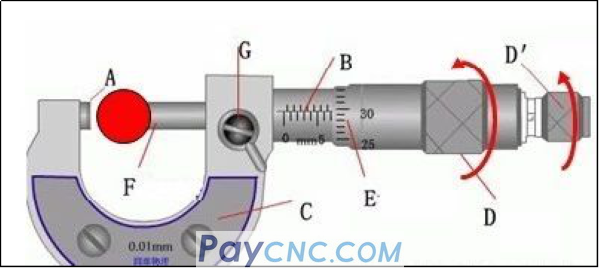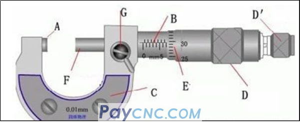 2. Hold the ruler holder (C) in the left hand, turn the coarse adjustment knob D with the right hand to make the distance between the measuring rod F and the measuring anvil A slightly larger than the measured object, put in the measured object, and turn the protection knob D′ to clamp the measured object until Until the ratchet makes a sound, turn the fixed knob G to fix the measuring rod and read.