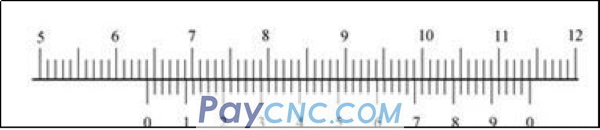 The 9th line after the sub-ruler 0 line indicates: 0.02x9= 0.18mm