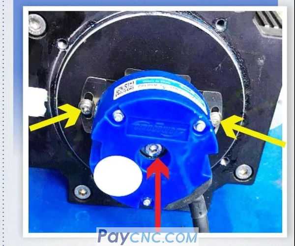 Để cài đặt bộ mã hóa mới, trước tiên, căn chỉnh các miếng kim loại ở cả hai mặt của bộ mã hóa với các lỗ vít lắp và siết chặt các vít. Sau đó sử dụng vít vừa tháo bộ mã hóa để khóa kết nối giữa trục bộ mã hóa và trục động cơ.