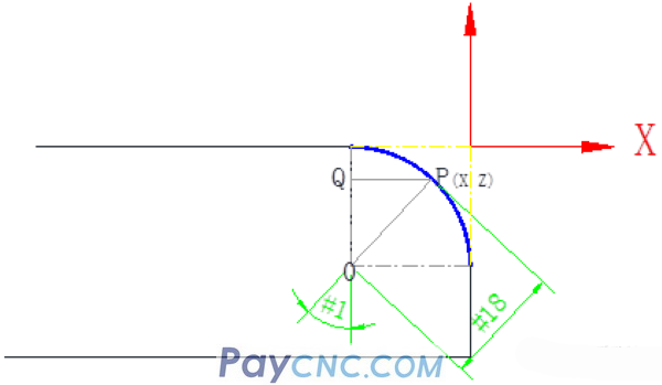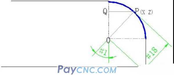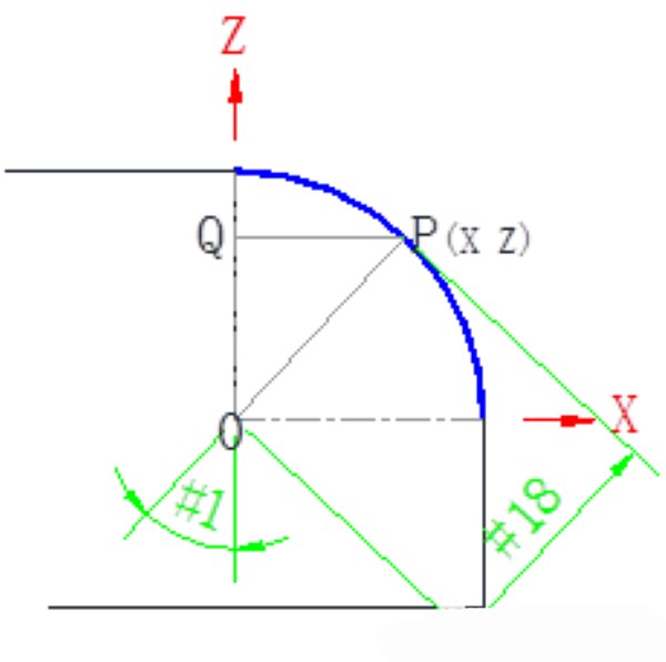 QP= SIN[#1]*#18 (The line segment QP represents the coordinate value of point P in the X direction)