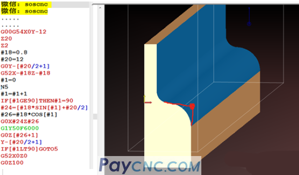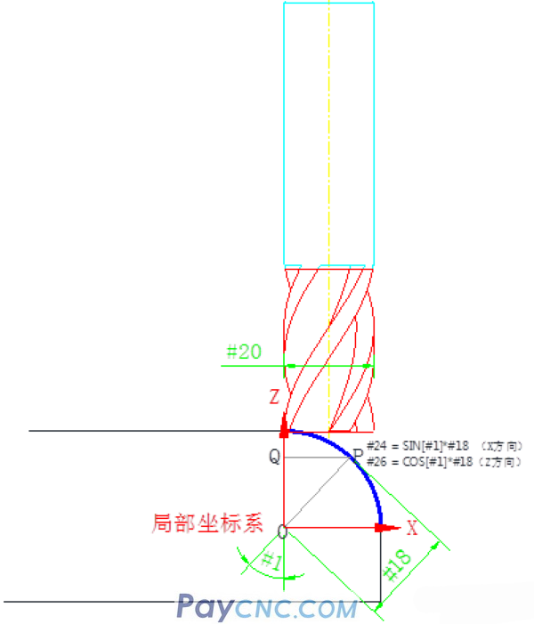 If the tool diameter #20 is considered in the program, #24 = SIN[#1]*#18 is the coordinate point in the X direction of the arc (as shown in the figure above), which needs to be offset by a tool radius value to the right, and finally #24= SIN[#1]*#18+#20/2