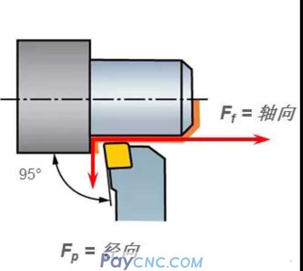 A imagem acima mostra uma ferramenta com um ângulo de avanço de 95 °. O comprimento da seta vermelha indica a magnitude da força nessa direção, ou seja, a força radial é menor que a força axial.