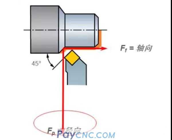 A imagem acima mostra um cortador com um ângulo de declinação principal de 45 °. O comprimento da seta vermelha indica a magnitude da força nessa direção, ou seja, a força radial é maior que a força axial.
