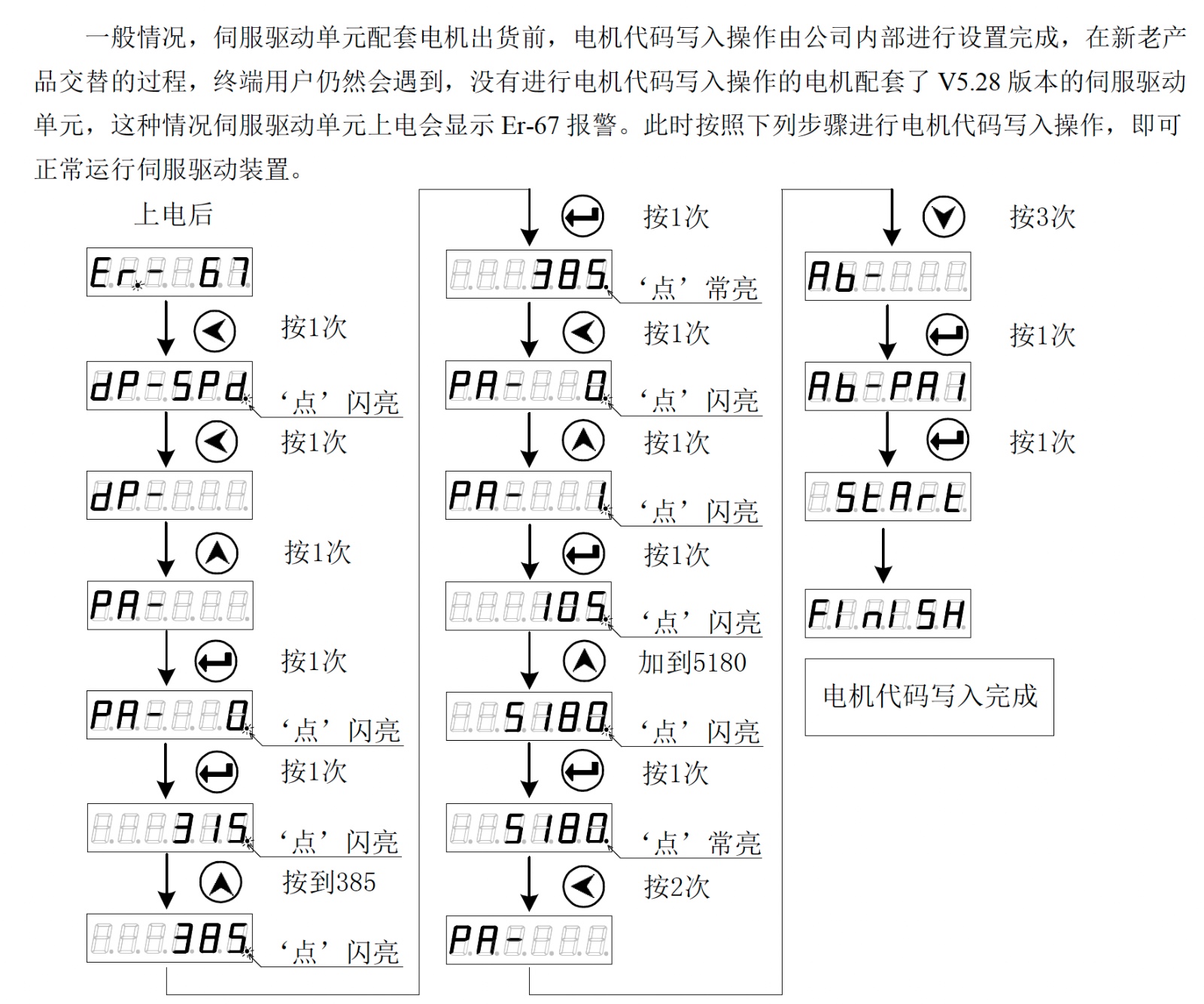 Generally, the motor code writing operation is set up and completed by the company before the servo drive unit is shipped. In the process of switching between new and old products, end users may still encounter a motor that has not been written with a motor code and is equipped with a servo drive unit of version V5.28. In this case, the servo drive unit will display an Er-67 alarm when it is powered on. At this time, follow the steps below to write the motor code, and the servo drive unit can operate normally.