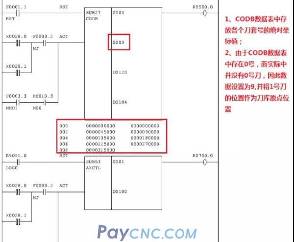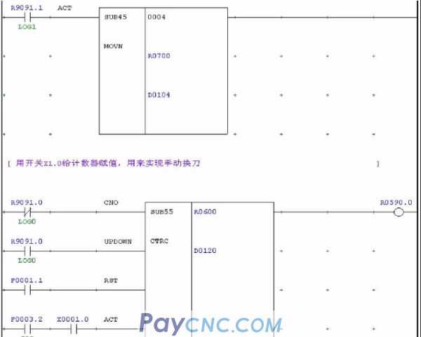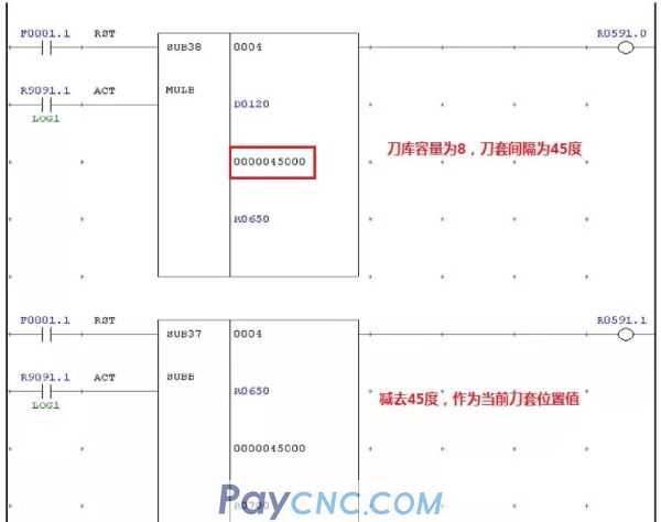 This method generally calculates the angle value between two tool pockets, calculates the rotation angle according to the specified tool pocket number, and controls the rotation of the tool head as a position value. For details, please refer to the "PMC" written by Su Kai in the OA technical document. Axis Function Command AXCTL Application" Click on the bottom of the article [Read the original text] to download the PDF document WeChat Official Account: CNC Notes; the method is described below in conjunction with the ladder diagram in the relevant part of the document.