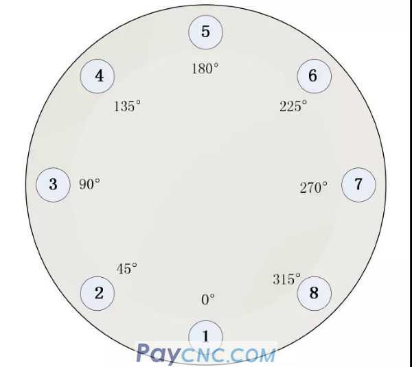 Through this method, automatic and manual cutter head rotation can be realized. Generally, machine tool manufacturers are accustomed to use the position of the first tool as the zero point of the tool magazine. Therefore, the actual tool pocket number and rotation degree are as shown in the figure below. Show. In automatic mode, if the fifth tool is changed, the instruction M06T05 (M06 is to call the macro program), the actual corresponding degree is 180, that is: 45*5-45, therefore, 45 degrees are subtracted by the SUBB function module in the ladder diagram . In manual mode, the tool is selected through X1.1. After the tool selection is completed, X0.0 instructs the tool magazine to rotate to the corresponding tool position.