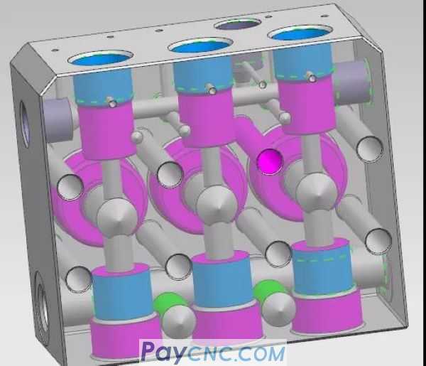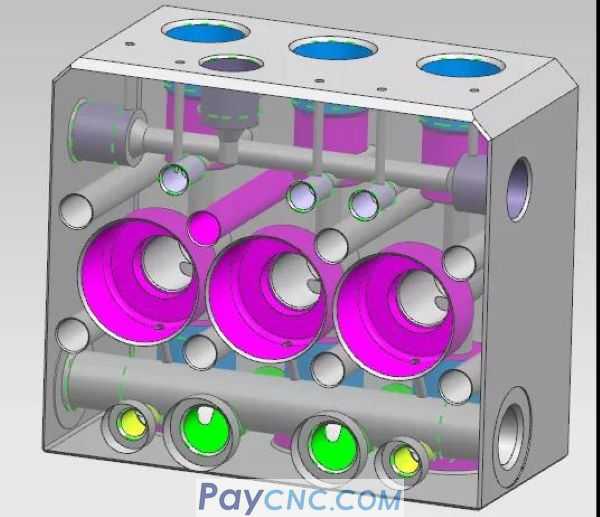 The front surface (large hole surface) and the left and right sides adopt a VMC850L machine tool + 4th axis rotating worktable, which is clamped at a time, and 3 surfaces are processed in one process mode;