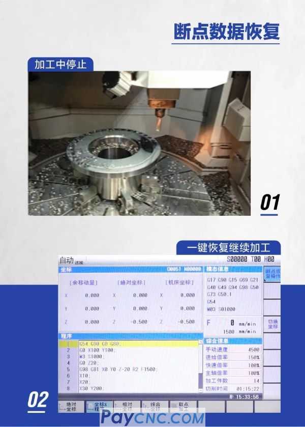 In the process of drilling, after the processing is interrupted due to an accident, simply press the "Breakpoint Data Recovery" button, and you can restore the previous processing position and state with one click to achieve continuous processing of the workpiece.