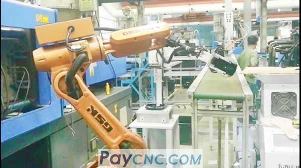 The injection molding machine's unloading, assembly, and sprue are integrated and automatically produced.
