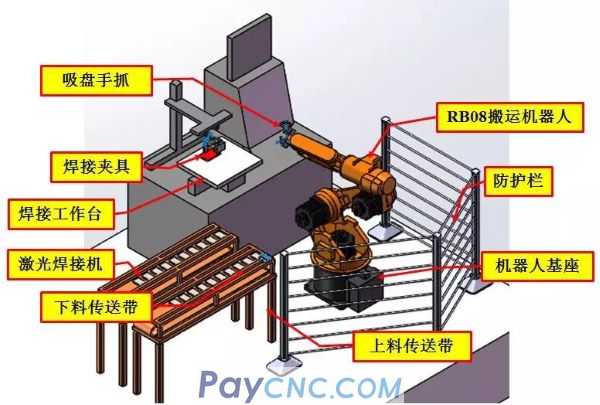 Two RB08 handling robots, two four-station suction cups for gripping, supporting two feeding and positioning conveyor lines, and one unloading conveyor line. The robot grips the workpiece for laser welding.
