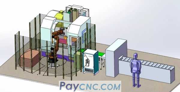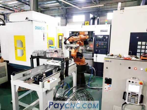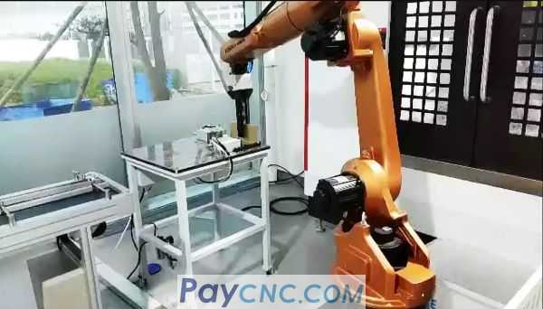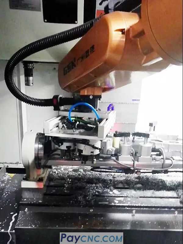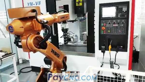 A GSK RB15L robot is equipped with sawing machine equipment, machining center equipment, conveying mechanism, secondary positioning mechanism, feeding platform or feeding line to complete the automatic processing of the workpiece.
