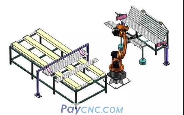 Vedtage en RB20-håndteringsrobot, samarbejde med en rørskærende transportørledning, en sorterings- og positioneringsindretning og en fodringstransportør for at afslutte den automatiske trimning, sortering og højtemperaturdannende fremstillingsproces af neonrør;