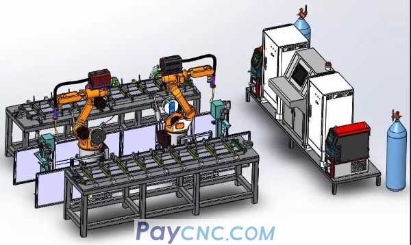 The project consists of two RH06 welding robots, two gun cleaning and wire cutting mechanisms, two sets of welding tools, two automatic welding power sources, and two sets of automatic anti-collision welding guns.