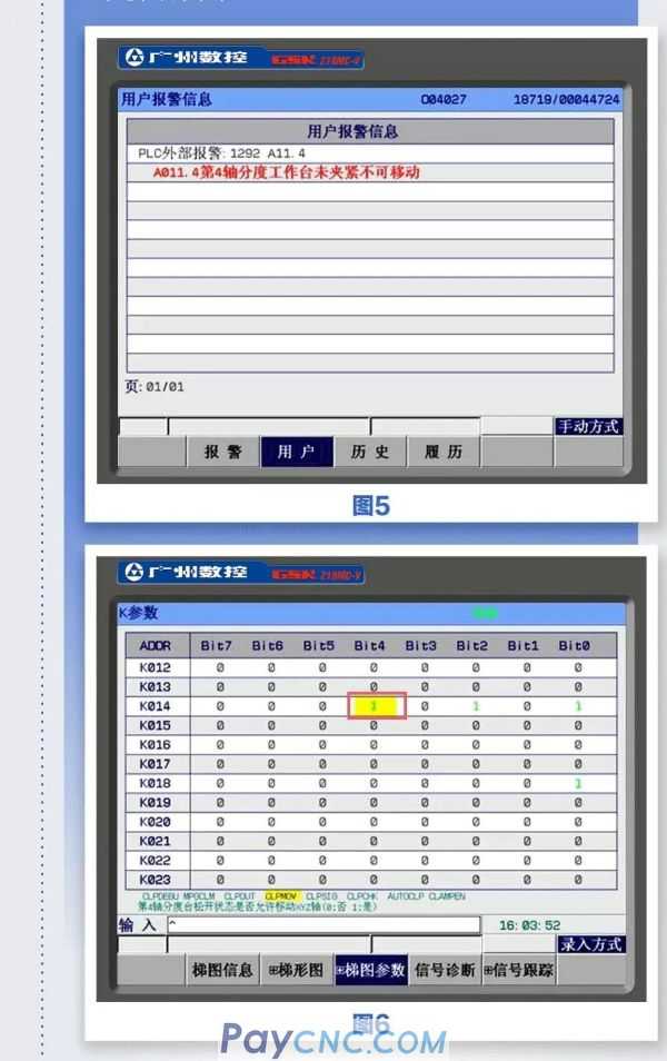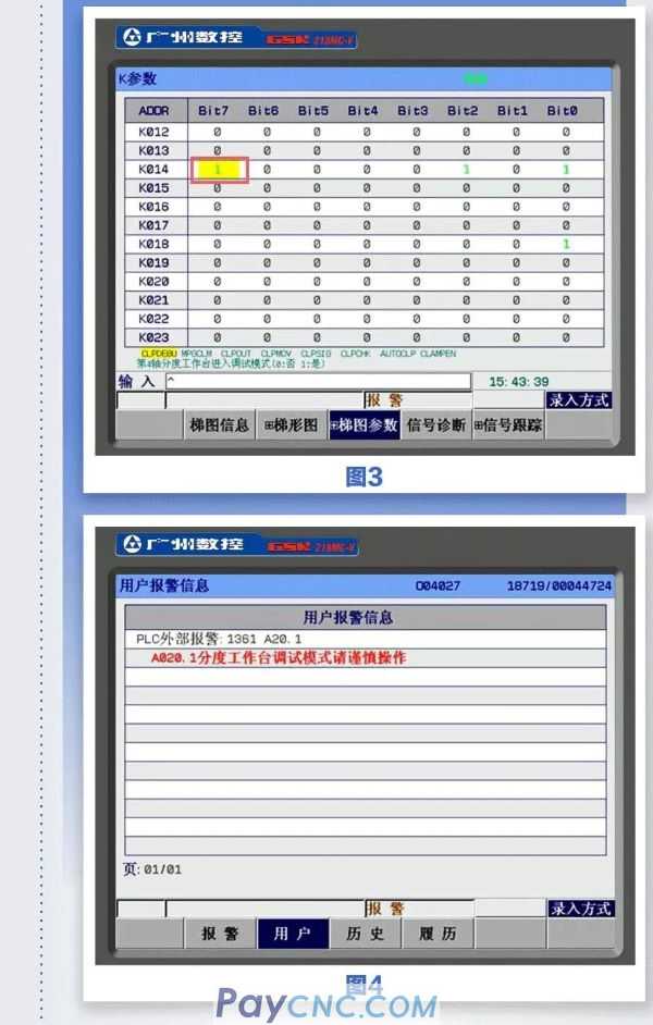 As u die rotasie van die vierde as moet ontfout, verander K14.7 na 1, soos getoon in Figuur 3, gaan dan na die werktafel-indekseringstabel-ontfoutingsmodus, en die PLC-aanhaling A20.1 verskyn, soos getoon in Figuur 4, die alarm word geïgnoreer en die handwielmodus is nou Die vierde as kan vrylik beweeg word sonder om inmekaar te hang met die sein van die los klem op sy plek;