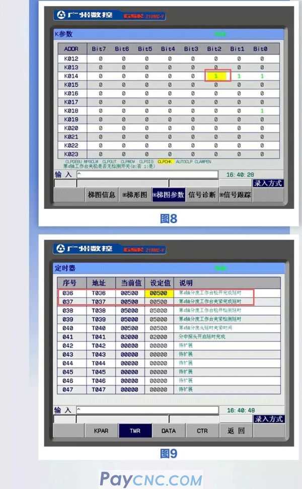 Die indekseringstabel hoef nie die skakelaars vir ontkoppeling van vrylating en klem te installeer nie. As die skakelaar nie geïnstalleer is nie, moet die parameter K14.2 verander word na 1, soos getoon in Figuur 8. Wanneer die skakelaar nie geïnstalleer is nie, word die timers T0036 en T0037 as virtuele vrystellings gebruik. In-posisie en klem-in-posisie vertraging opsporing, moet die gebruiker hierdie tyd instel volgens die snelheid van die meganiese werking, die standaard is 500ms, soos getoon in Figuur 9;