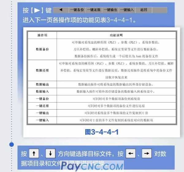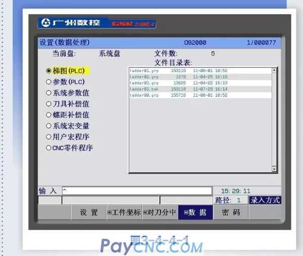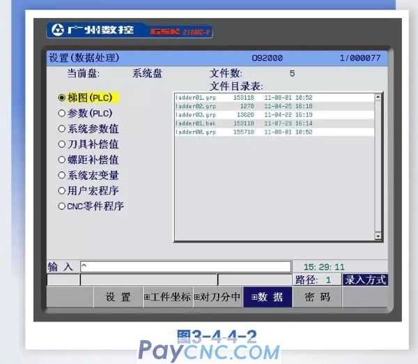 01Press【+DATA】soft key to enter the setting (data processing) interface. User data (ladder diagram, ladder diagram parameter, system parameter value, tool compensation value, pitch compensation value, system macro variable, user macro program, CNC part program) can be backed up (saved) and restored (read); U disk or PC for data output and input operations. While backing up and restoring data, it does not affect the part programs stored in the CNC (see Figure 3-4-4-1).
