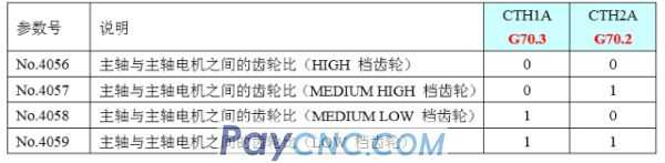 No. 4056~4059 are used to set the gear ratio between the spindle and the spindle motor. For example, when the spindle rotates once and the motor rotates 2.5 times, please set 2.5*100=250 for this parameter. The use of parameters is selected by the input signals CTH1A (G70.3) and CTH2A (G70.2). The gear and gear coupling state should correspond to the input signals CTH1A (G70.3) and CTH2A (G70.2).