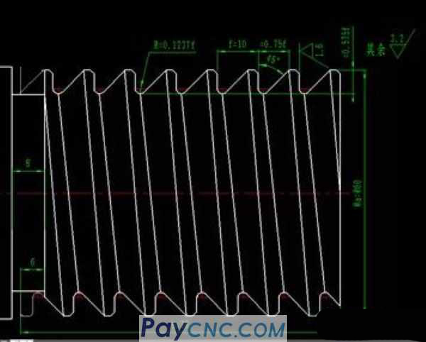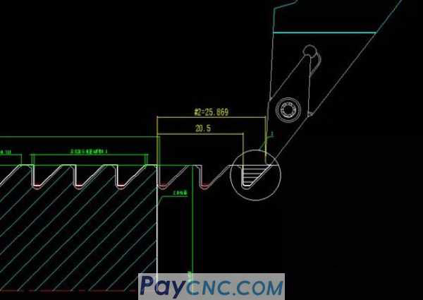 As shown in the above diagram, if the set variable #2=25.869 is the starting point of the thread (Z-direction) cycle, turn to Z=20.5 (leave 0.5mm margin on both sides and sides, that is, the width of coarse turning tooth: 5.369mm)