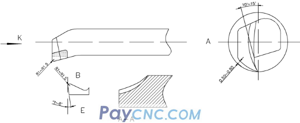 When sharpening, the rake angle is rounded with an arc-like angle of 10-15°, the back angle is 0.5-0.8mm away from the wall according to the machining arc (the bottom line of the tool is along the radian), c cutting edge angle k direction is §0.5-1 as the edge The wiper at point B of the chip edge is R1-1.5, the auxiliary relief angle is ground to 7-8°, and the point AA of the E inner edge is ground into a circle to remove chips.