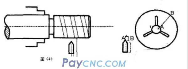 Suppose the starting position of the thread of the just-turned car is at point 2, and the starting position of the original thread is at point l. Draw a line AB on the chuck along point 2 and then release the jaws. Rotate the part from the first point to the second point against the marking line AB. If the workpiece moves axially during rotation, the thread cutter must be re-aligned in the z direction.