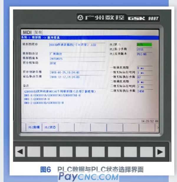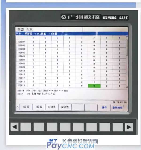 Press the "PLC data" key (as shown in Figure 6) below the system screen to enter the K parameter setting surface in the system PLC, move the cursor to K14.2 (as shown in Figure 7), and in the entry mode, press the number Press key [0], [1] or [Enter] to modify the K14.2 parameter value, and press the "Save" key after the modification.