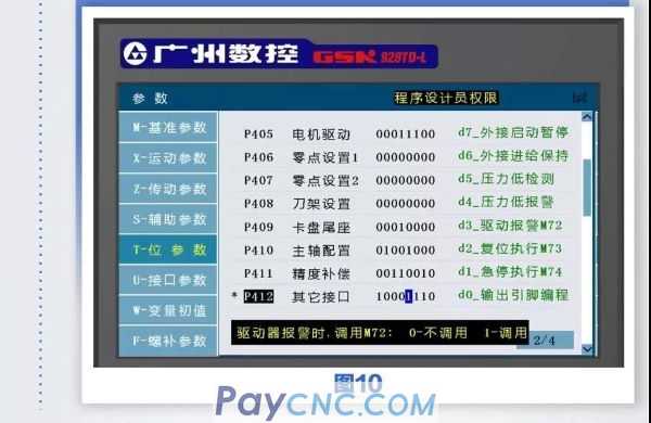 Related parameters: P412_d3/d2/d1 parameter sets whether to call and execute M72/M73/M74 custom commands when the drive alarms/resets/emergency stop. For example, Figure 10: