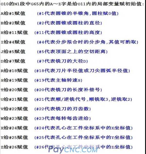N1 G65 P11 Aa Bb Hh Cc Ii Jj Dd Rr Ss Tt Uu Vv Ww Xx Yy Zz; (call the O11 program and assign initial values to the variables)