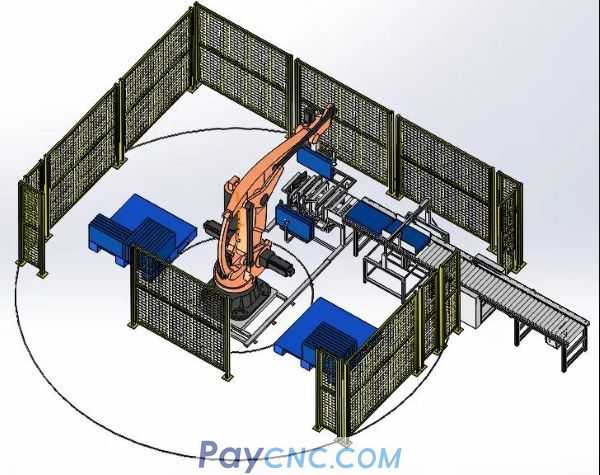 1 RMD120 palletizing robot, 1 set of customized flexible telescopic grippers, 1 incoming material turning mechanism, combined with the automatic incoming material in the front section, to complete the workpiece positioning and grasping, and the robot automatically palletizes the production process;
