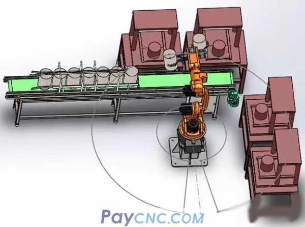 1 RMD08 handling robot, cooperate with inner container conveyor line, 2 roll welding machines, 1 laser marking equipment to complete automatic roll welding and marking production of vacuum inner container;