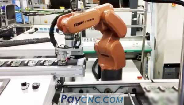 Robot zgrabi vezje s traku pasu in ga položi v pladenj za proizvodnjo stiskalnice;Proizvodni cikel: 4,5 sekunde / kos, paleto je treba sestaviti v 40 sekundah.