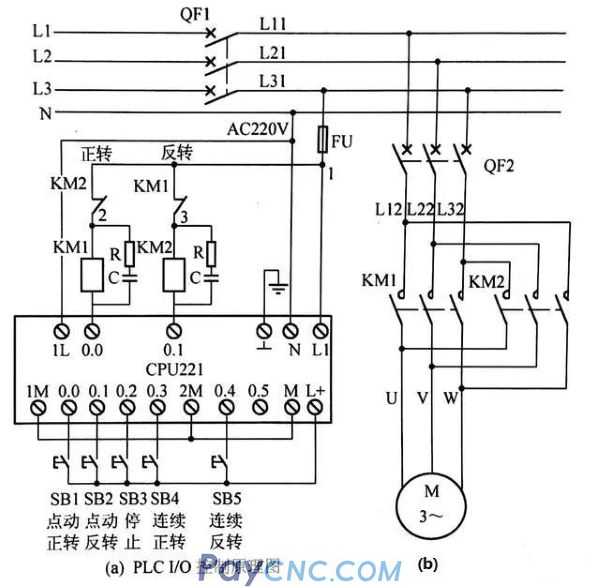 In the front, 5 buttons are used to realize the jog and continuous start and stop control of the material carrier. In fact, the jog and continuous control modes can also be selected by the rotary switch. At this time, the forward and reverse stop buttons are still needed, and the electrical schematic diagram has slightly changed. Input signal: 1 rotary switch, 1 forward rotation start button, 1 reverse rotation start button, 1 stop button, at least 4 points are required for input. The output signal is the same as before, one for each contactor coil, at least 2 points are required. Still choose CPU221 (input 6 points, output 4 points) relay output type.