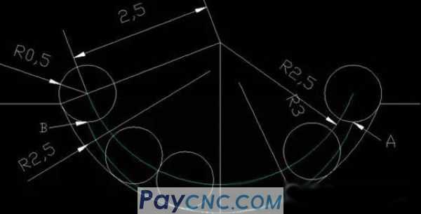 Assuming that this is a tool tip of R0.5, if you add C-type tool compensation, the path of the tool is the same as the above picture, but if you don’t add it, how to eliminate the error, first look at the center of the tool tip arc, which is the top one in the picture above The trajectory taken by the green line is an arc of R2.5. Then look at the tip of the tool, which is A (tool setting point). The arc from A to B is also an arc of R2.5 as above. , The arc of R3 allows the tool tip to follow the arc of R2.5. The focus here is the coordinates of the starting point and end point of the arc of the tool tip.