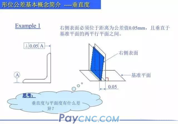 Indicates that the measured element on the part maintains the correct 90 degree angle relative to the reference element. When a direction is given, the tolerance zone is the area between two parallel planes (or straight lines) whose distance is the tolerance value and perpendicular to the reference plane (or straight line, axis); when two mutually perpendicular directions are given , Is the area within the quadrangular prism whose normal cross-sectional dimension is the tolerance value t1Xt2 and is perpendicular to the reference axis.