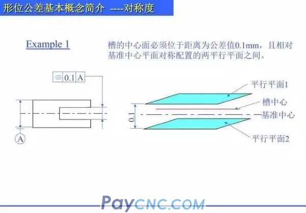 It means that the two symmetrical center elements on the part remain in the same plane. The tolerance zone is the area between two parallel planes (or straight lines) whose distance is the tolerance value t and is symmetrically arranged with respect to the reference center plane (or center line, axis). If two directions perpendicular to each other are given, it is the area within the quadrangular prism whose front section is the tolerance value t1Xt2.