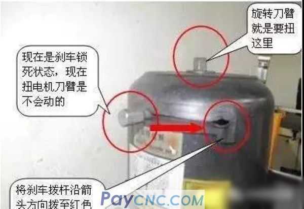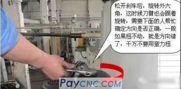 2. Loosen the brake device on the motor (the motor arm cannot be twisted if it is not loosened), and use the adjustable wrench to rotate the outer hexagon on the motor. Generally, the direction of rotation is the same as that of the knife arm, so that the knife arm can be separated. Spindle tool. While the person above rotates the knife arm, the person below must pay attention to the direction of rotation of the knife arm, and promptly remind the person operating above, because he cannot see the actual situation.